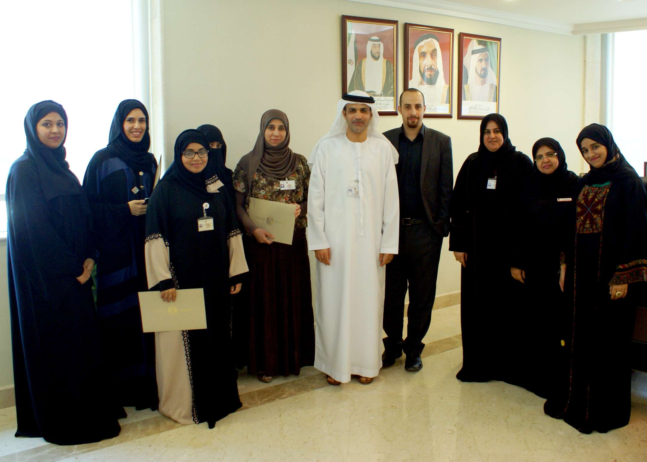 The three nursing winners of the Distinguished Employee Award (Testahel) -within the medical professions category- have been honored by H.E Dr. Yousif Mohammed Al-Serkal, Assistant Undersecretary for the Hospitals Sector in the Ministry of Health (MOH). The winners were honored in a ceremony organized by the Hospitals Sector and in the presence of Ms. Fatima Al-Wali, from the Department of Corporate Excellence, and Ms. Aysha Ali Al-Mahri, Director of the Department of Nursing. The three winners of the award were: Ms. Jamila Khalaf Al- Hosani, Director of Nursing at Ajman Medical District, Ms. Shaikha Ibrahim Al Ali, Director of Nursing at Umm Al Quwain Medical District, and Mr. Jamal Mohammed Al-Foqaha Senior Charge Technician at Sharjah Medical District.