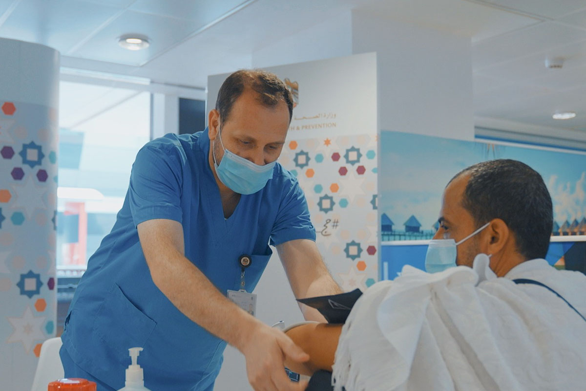 تحرص وزارة الصحة ووقاية المجتمع على التواجد مع قوافل الحج في المطار قبل مغادرتهم الدولة، لتقديم النصائح والإرشادات الصحية للحجاج اثناء أدائهم مناسك الحج، وذلك من خلال فريق صحي متخصص وفرت له جميع الإمكانات، بهدف ضمان حج آمن صحياً